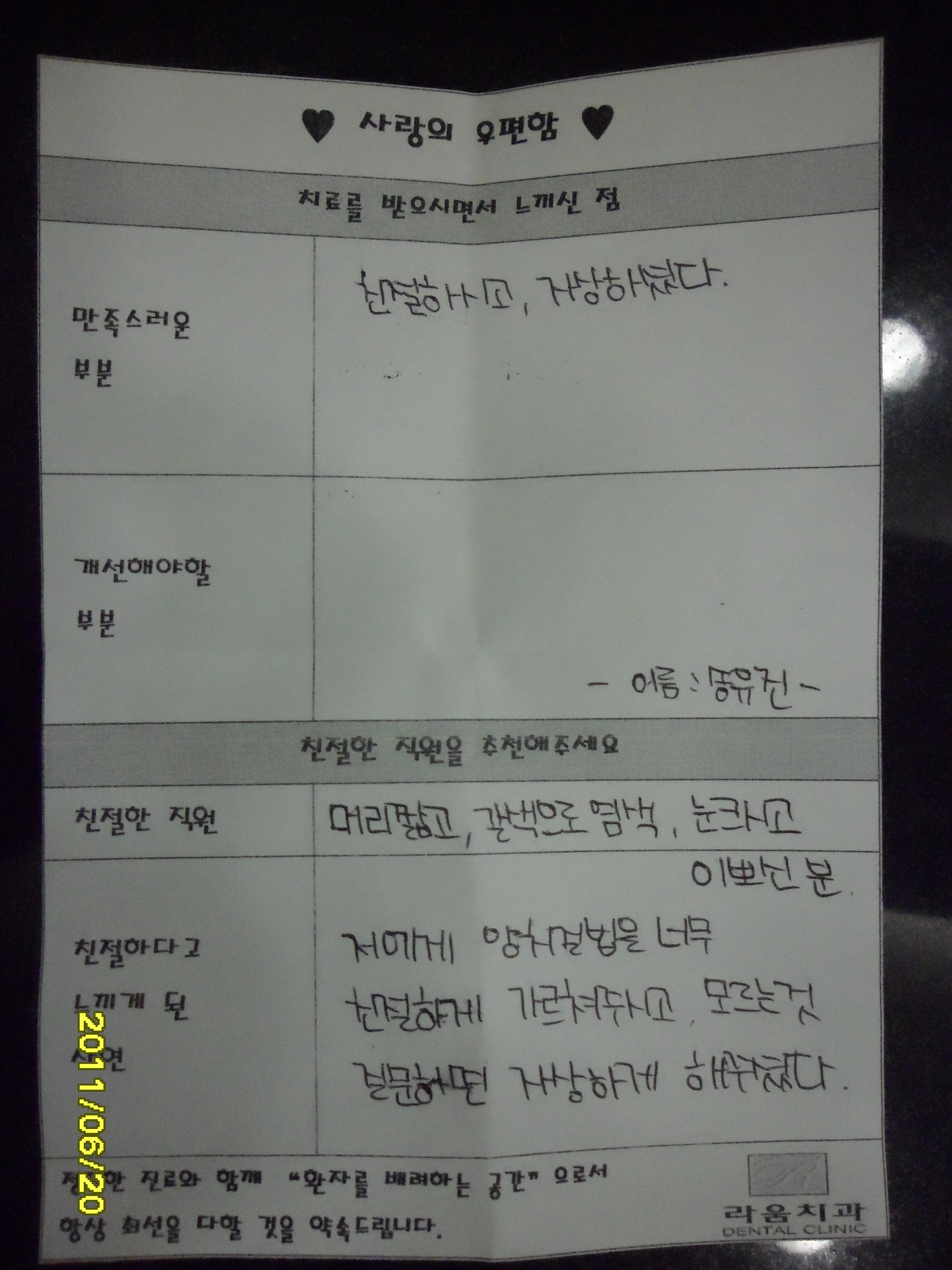 더 나은 라움치과를 만들기위해 시행하는 설문지에 환자분께서 글을 남겨주셨습니다.